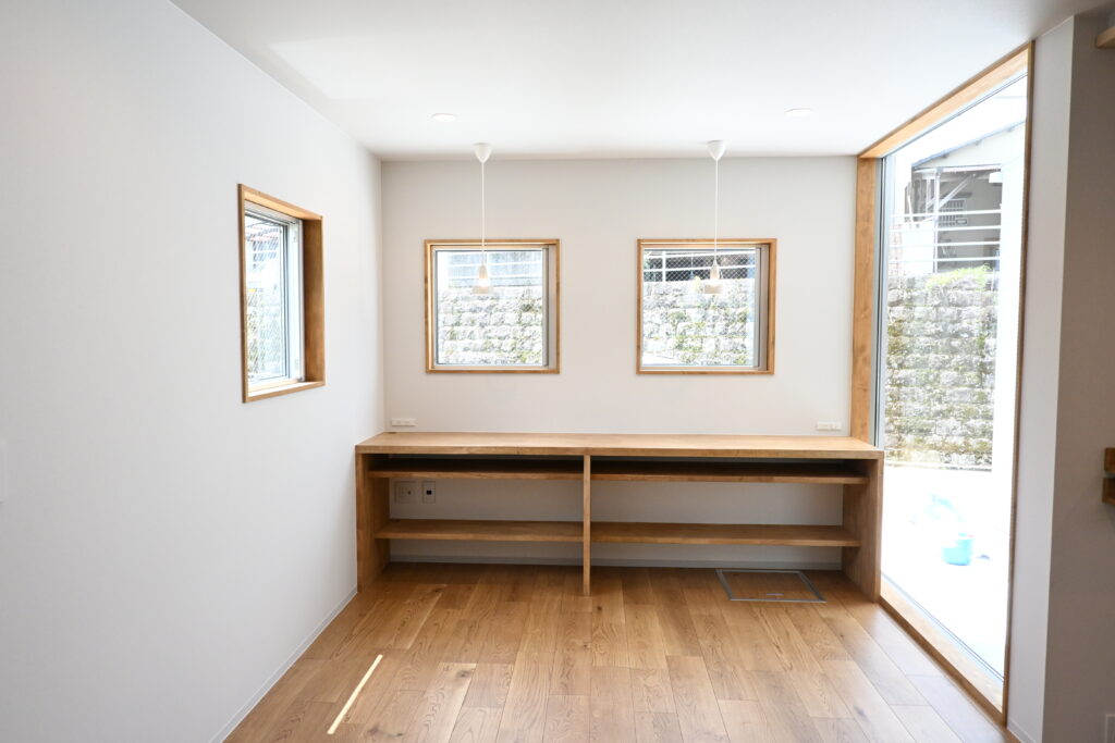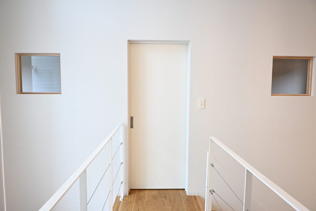 二階の子供部屋にも小窓を設け、吹き抜けの一階とのつながりを意識した間取りとなっています。